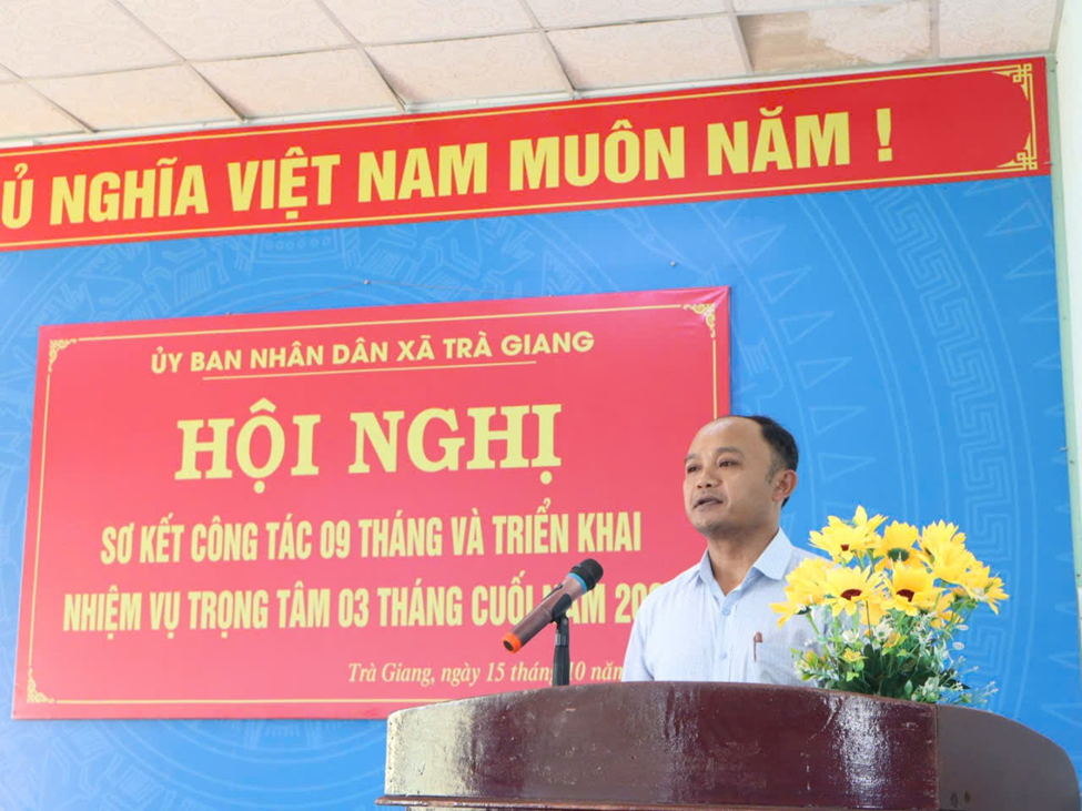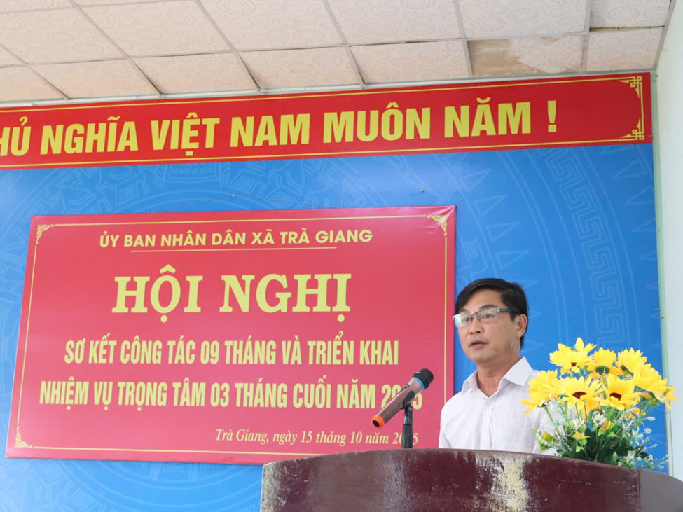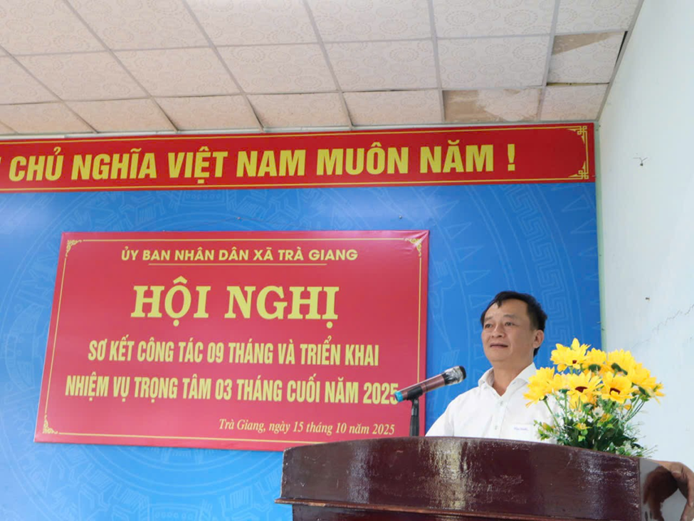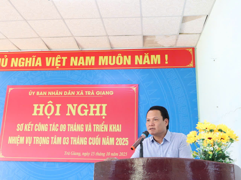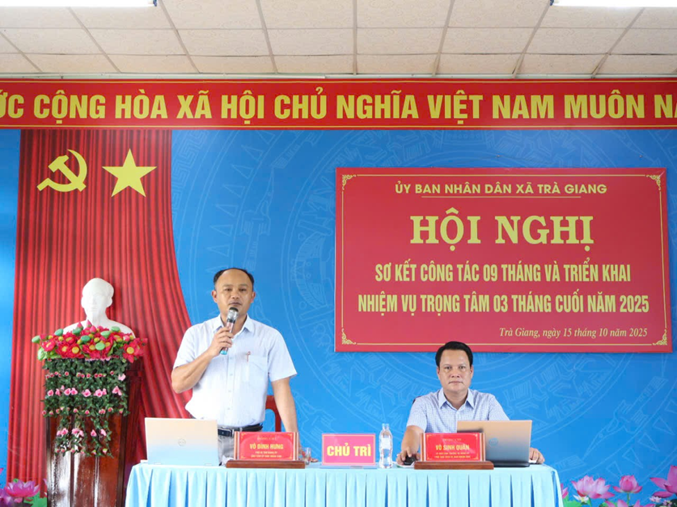 Chiều ngày 15/10, Ủy ban nhân dân xã Trà Giang tổ chức Hội nghị sơ kết công tác 9 tháng đầu năm và triển khai nhiệm vụ 3 tháng cuối năm 2025. Đồng chí Võ Đình Hưng – Phó Bí thư Đảng ủy, Chủ tịch UBND xã và đồng chí Võ Sinh Quân – Ủy viên Ban Thường vụ Đảng ủy, Phó Chủ tịch UBND xã đồng chủ trì hội nghị.