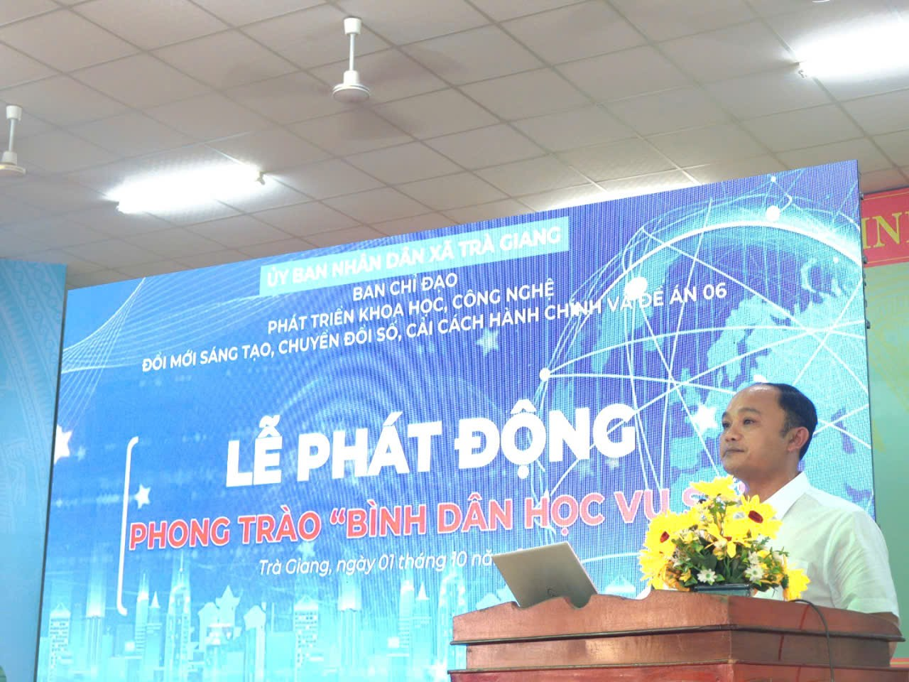 Phát biểu tại buổi lễ, đồng chí Võ Đình Hưng – Phó Bí thư Đảng ủy, Chủ tịch UBND xã, Trưởng Ban Chỉ đạo phát triển khoa học, công nghệ, đổi mới sáng tạo và chuyển đổi số của xã – nhấn mạnh: “Bình dân học vụ số” là bước đi quan trọng để xây dựng công dân số, góp phần hình thành xã hội học tập, rút ngắn khoảng cách số, nâng cao dân trí và thúc đẩy phát triển kinh tế - xã hội tại địa phương. Phong trào “Bình dân học vụ số” ở Trà Giang không chỉ mang ý nghĩa kế thừa truyền thống học tập, mà còn mở ra hướng đi mới, thiết thực trong kỷ nguyên công nghệ số, thể hiện quyết tâm của Đảng bộ, chính quyền và Nhân dân xã trong quá trình đổi mới và hội nhập.