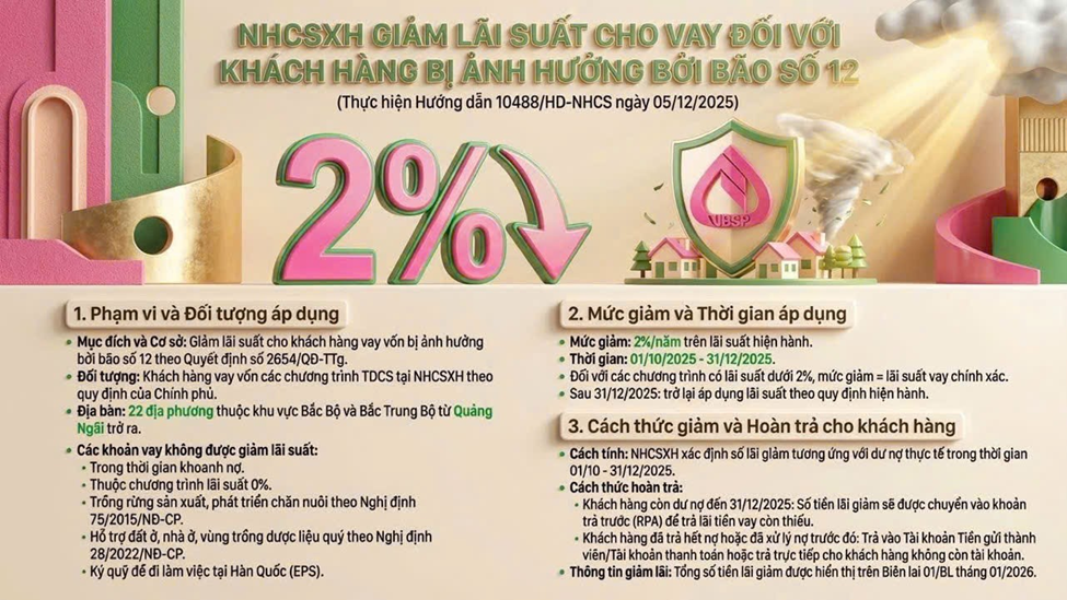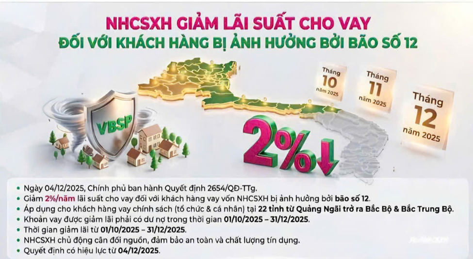 Thực hiện Quyết định số 2564/QĐ-TTg ngày 05/12/2025 của Thủ tướng Chính phủ về việc giảm lãi suất cho vay đối với khách hàng vay vốn tại Ngân hàng Chính sách xã hội (NHCSXH) bị ảnh hưởng sau cơn bão số 12 (Quyết định 2654/QĐ-TTg); công văn số 10488/HD-NHCS ngày 05/12/2025 của Tổng Giám đốc Ngân hàng Chính sách xã hội (NHCSXH) về thực hiện giảm lãi suất cho vay đối với khách hàng vay vốn tại NHCSXH theo Quyết định số 2564/QĐ-TTg ngày 05/12/2025 của Thủ tướng Chính phủ;