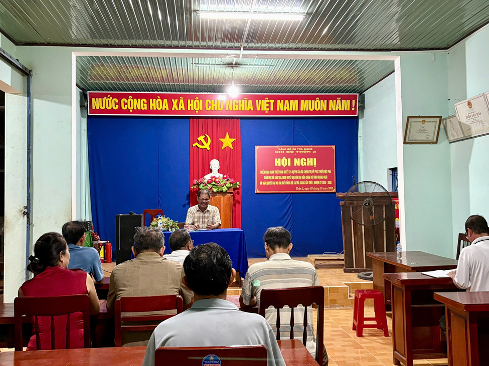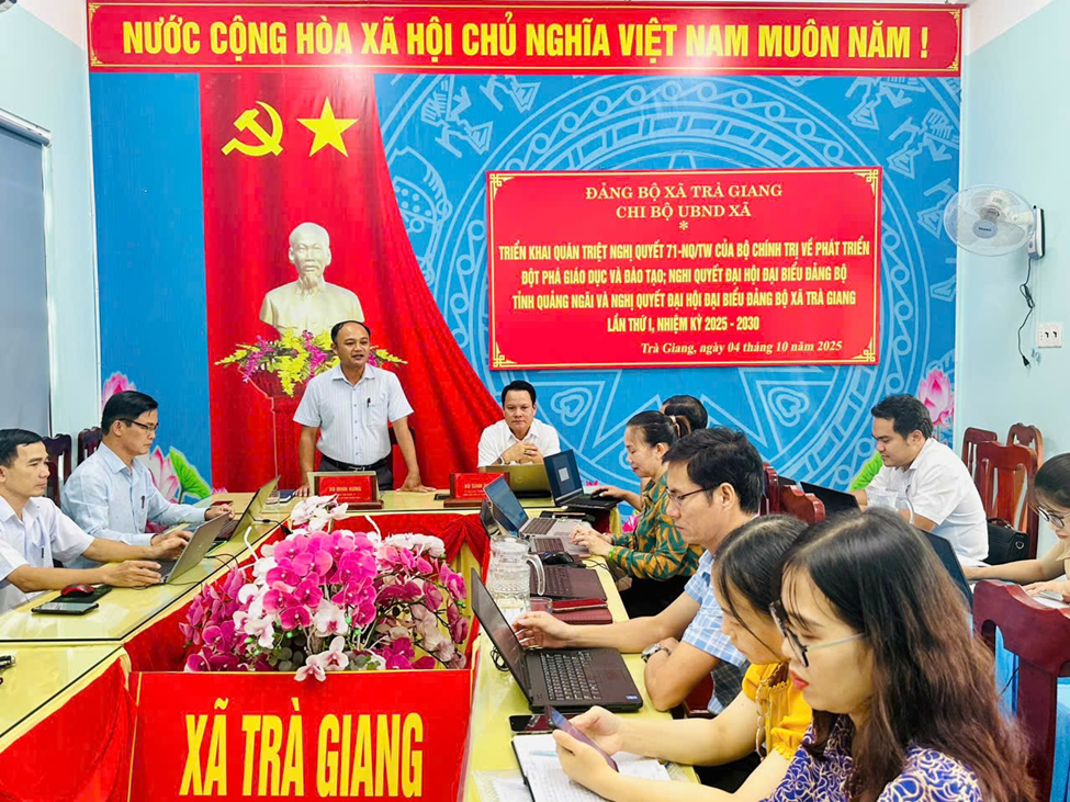 Cũng trong đợt sinh hoạt lần này, các chi bộ tập trung vào việc nghiên cứu, thảo luận những nội dung cốt lõi của Nghị quyết số 71-NQ/TW của Bộ Chính trị về phát triển đột phá giáo dục và đào tạo; các định hướng, nhiệm vụ được xác định trong Nghị quyết Đại hội Đại biểu Đảng bộ tỉnh Quảng Ngãi lần thứ XX; và đặc biệt là Nghị quyết Đại hội Đại biểu Đảng bộ xã Trà Giang lần thứ I, nhiệm kỳ 2025 – 2030.
