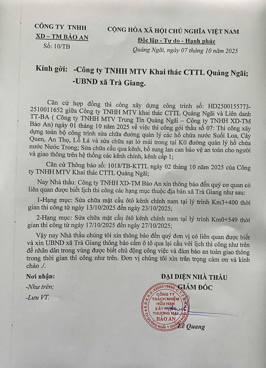 Tiêu đề văn bản | THÔNG BÁO V/v triển khai thi công công trình: Sửa chữa mặt cầu ô tô kênh chính nam tại lý trình Km3+400, thôn 7, xã Trà Giang, tỉnh Quảng Ngãi | ||